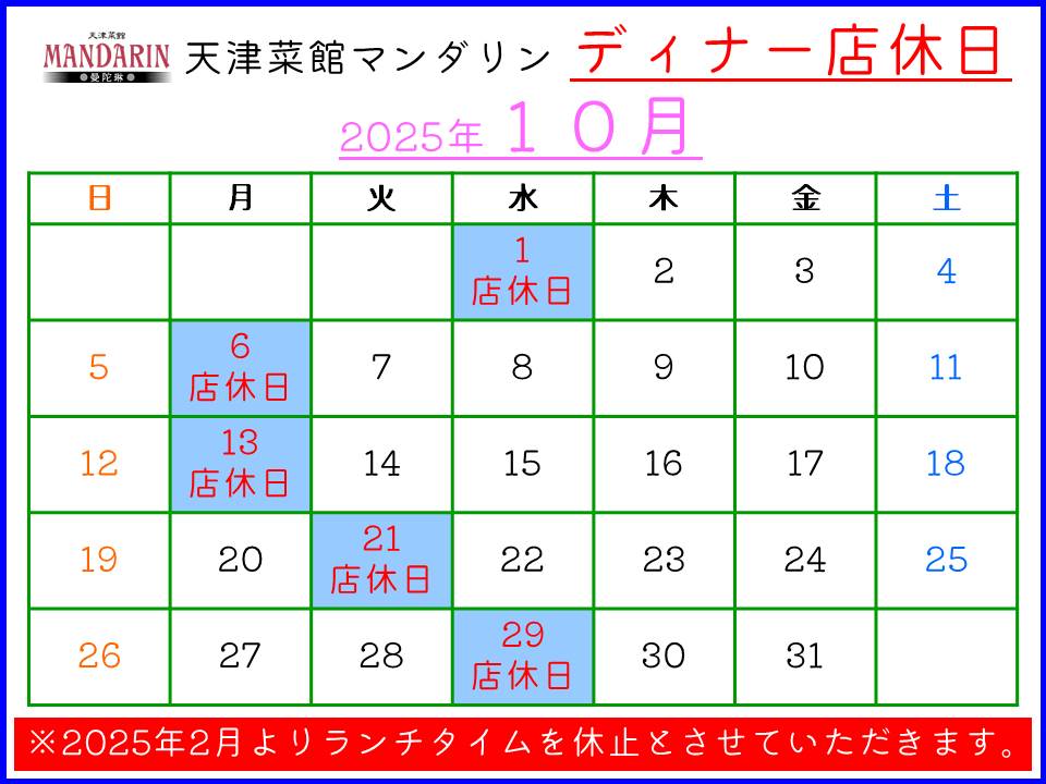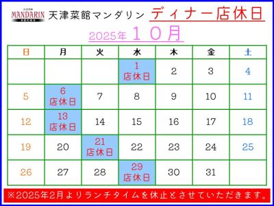 中華レストラン【天津菜館マンダリン】10月のディナー店休日をお知らせいたします。
